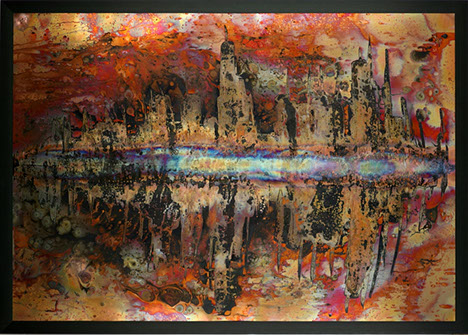 Je réalise des créations sur feuilles de cuivre, avec un pinceau de feu. La caresse de la chaleur doit être finement dosée pour obtenir la teinte souhaitée. L'utilisation de cette technique a généré les "Pyrogrammes" en 2011-2014, les "Drip-Drop", 2015-2017, et les "Suminagashi" à ce jour et à l’avenir.