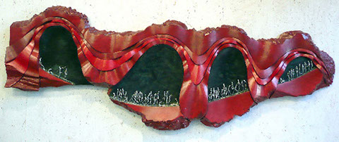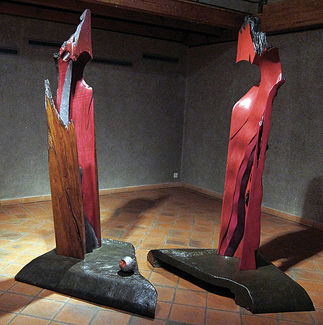 Ce travail s’appuie tant sur la structure naturelle des bois utilisés que sur l’application stricte de séries d’ondulations mathématiquement définies. De cette combinatoire, naissent des pièces façonnées en une succession de strates vallonnées sur lesquelles systématique et aléatoire génèrent des jeux de forces, des espaces aux évocations minérales intemporelles; espaces où s’invitent parfois de fragiles images de la présence humaine.
