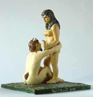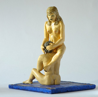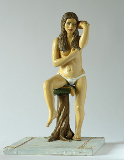 De cette recette résultent mes sculptures, personnages créés d’imagination, moulés dans un matériau qui me permet presque la liberté des formes de la fonte. La polychromie (qui existait dans la Grèce antique) me permet de narguer cette vieille frontière entre beaux-arts et arts décoratifs et un certain humour trahit mon peu d’intérêt pour un art élitiste.