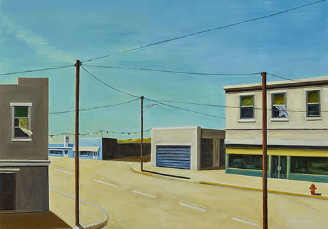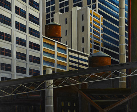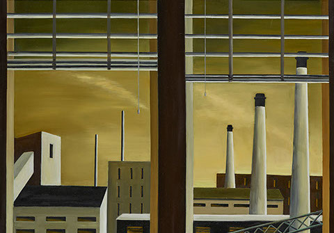 Mes thèmes de prédilection sont à présent les paysages industriels et urbains : bâtiments épurés, géométriques, villas modernes, buildings, installations agricoles, châteaux d’eau, cheminées d’usines… Cette architecture rectiligne me permet de jouer sur les tons et couleurs. J’imagine une source de lumière et les ombres qui en découlent, afin de rendre un éclairage plus théâtral.