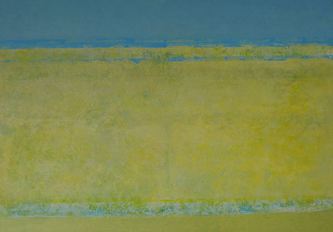 Les champs chromatiques sont travaillés par couches successives. La couleur et la texture ont leur importance. Le travail avance entre forme et non-forme. Je dirai qu’en travaillant longuement une toile, une dimension nouvelle s’ouvre, dans laquelle je peux longuement me promener, me perdre, revenir sur mes pas. Concrètement : construire, effacer, creuser, absorber… tout en essayant de garder le chemin ouvert.